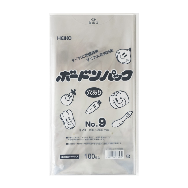 防曇効果に優れ、生鮮野菜・青果など水分を含んだ食品包装に最適です、防滴加工されたフイルムですので水滴を発生しにくく内容物の腐敗が少なく食品の鮮度を保持します。プラマーク入り。